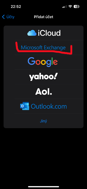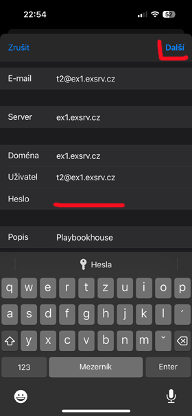 Postup nastavení Exchange účtu na iOS telefonu How to set up an Exchange account on your iOS phone - místo uživatelského jména a hesla (t2@ex1.exsrv.cz) použijte přidělené. use yours instead of your username and password!
