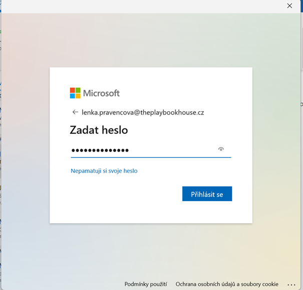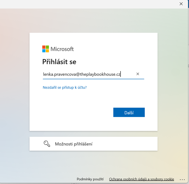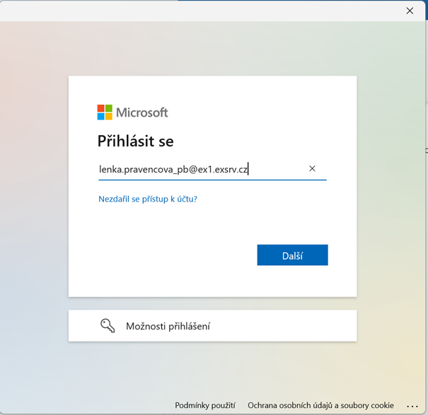 nejprve vyskoci okno Microsoft – Prihlasit se