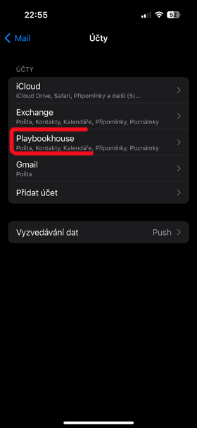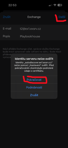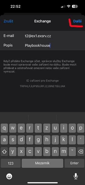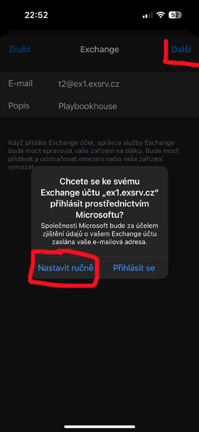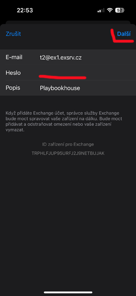 Postup nastavení Exchange účtu na iOS telefonu How to set up an Exchange account on your iOS phone - místo uživatelského jména a hesla (t2@ex1.exsrv.cz) použijte přidělené. use yours instead of your username and password!